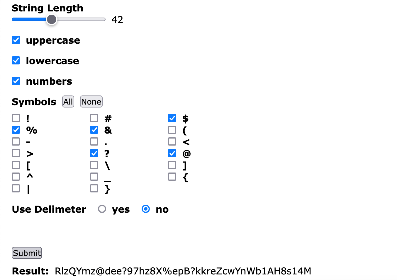Create a randomized string for passwords, or other uses of randomized characters. Uses the browser's Crypto Api for true randomness.